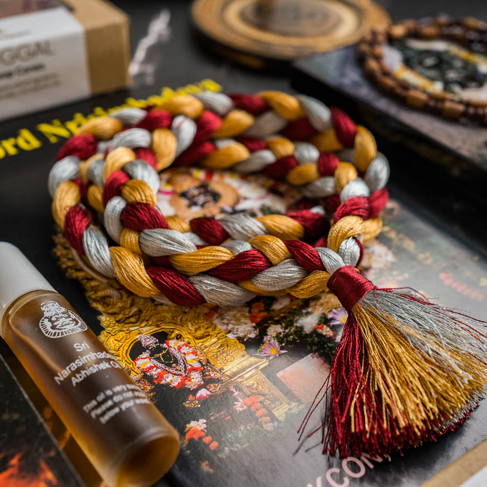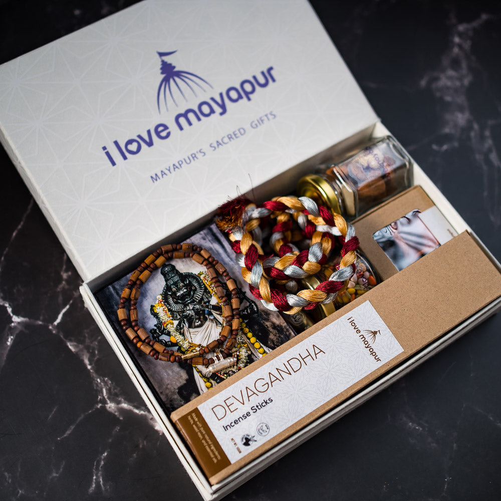 Bring home blessings from Mayapur with our carefully curated gift box. Inside you’ll find sacred items to protect, inspire, and uplift: a Silver Narasimha Kavacha, Tulsi Kunti Mala, Maha Oil, a picture of Narasimhadeva, Sri Nrisimha-Kavaca-Stotram, Mahaprasad, Pavitra, fragrant incense & dhoop.
