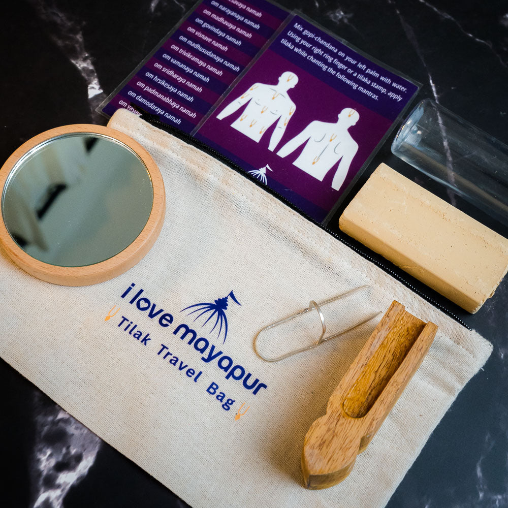 Includes Chandan, Tilak Stamp (Wood & Metal), Mantra Text, Waterbottle, Mirror, and Bag for applying tilak. (very good for the road)