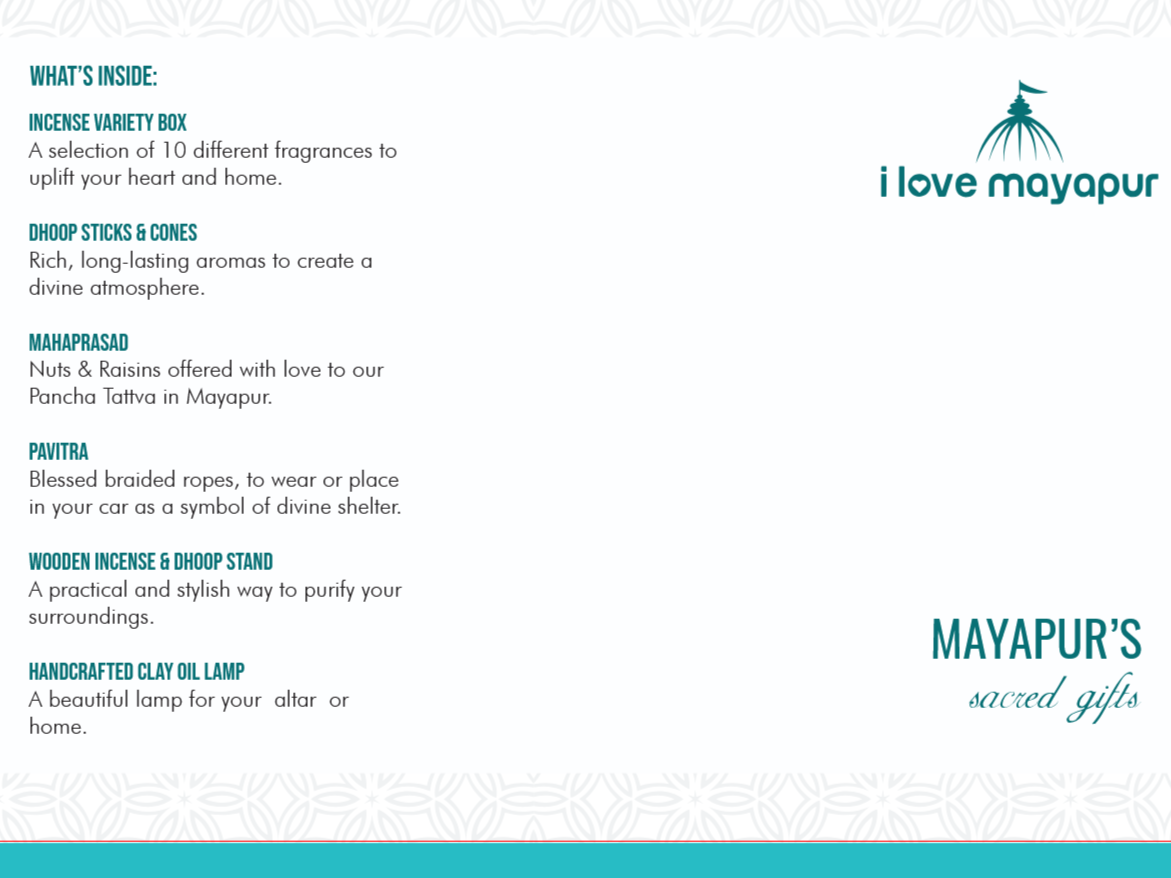 You can actually smell Mayapur when you open this box. Each set includes a beautiful incense collection, oil lamp, incense holder, Mahaprasad, and a Pavitra offered to Mahaprabhu — all beautifully presented and filled with the divine fragrance of devotion.